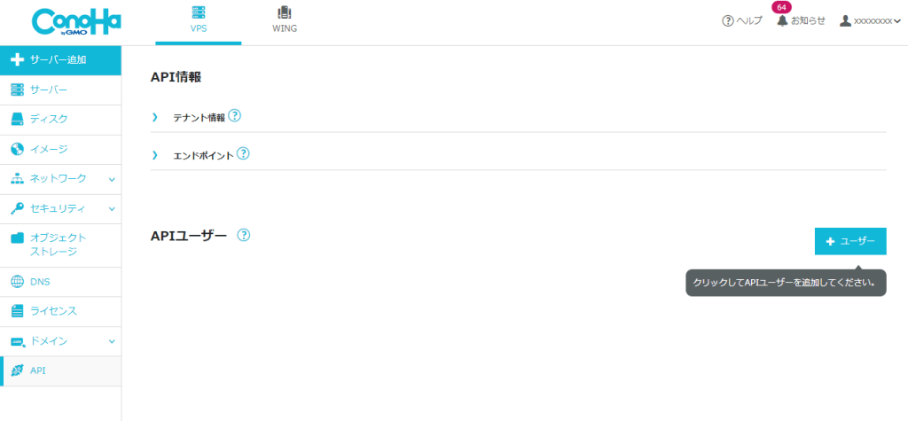まずはこちらから API を触るために必要な API ユーザを作成します.とてもわかりやすい画面なので迷わないとは思いますが,「+ユーザー」ボタンをクリックして API ユーザを作成します.